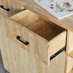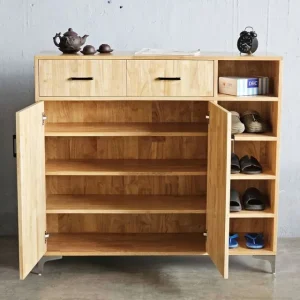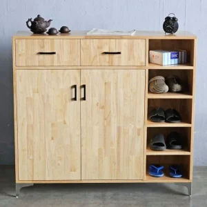Tủ giày KG68079 được làm bằng chất liệu gỗ cao su AA, trải qua quá trình xử lý tỉ mỉ, chà nhám kỹ lưỡng và phủ lớp chống thấm cao cấp, đảm bảo độ bền và khả năng chống thấm nước. Thiết kế thông minh với 2 ngăn kéo rộng rãi ở phần trên, tiện lợi để cất giữ những vật dụng nhỏ như chìa khóa, ví hoặc các phụ kiện khác. Ngăn tủ kín bên dưới, chia thành 4 tầng, cung cấp không gian lưu trữ giày dép đa dạng, giúp bạn sắp xếp gọn gàng và dễ dàng tìm kiếm. Đặc biệt, ngăn kệ giày mở bên phải với 5 tầng, không chỉ đáp ứng nhu cầu cất giữ giày dép mà còn là điểm nhấn trang trí thú vị cho không gian.